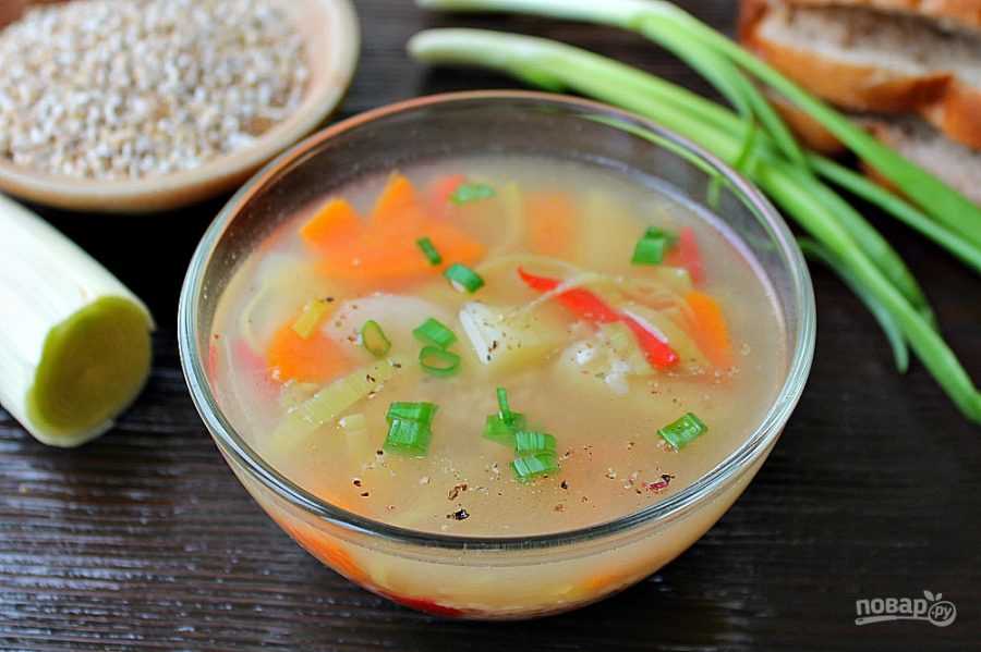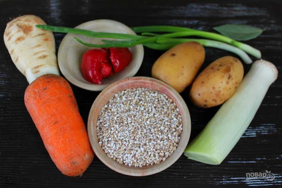 В кастрюлю влейте воду и доведите до кипения. Овощи вымойте, очистите и нарежьте (кубиками, брусочками, тонкими ломтиками). Воду подсолите и отправьте морковь, пастернак и картофель. Крупу промойте и всыпьте следом. Варите на медленном огне минут 10. После добавьте нарезанный перец и лук-порей, всыпьте любимые специи для более интенсивного аромата и вкуса. Варите еще 5-10 минут до полной готовности овощей и крупы. Перед подачей дополните суп зеленью.
