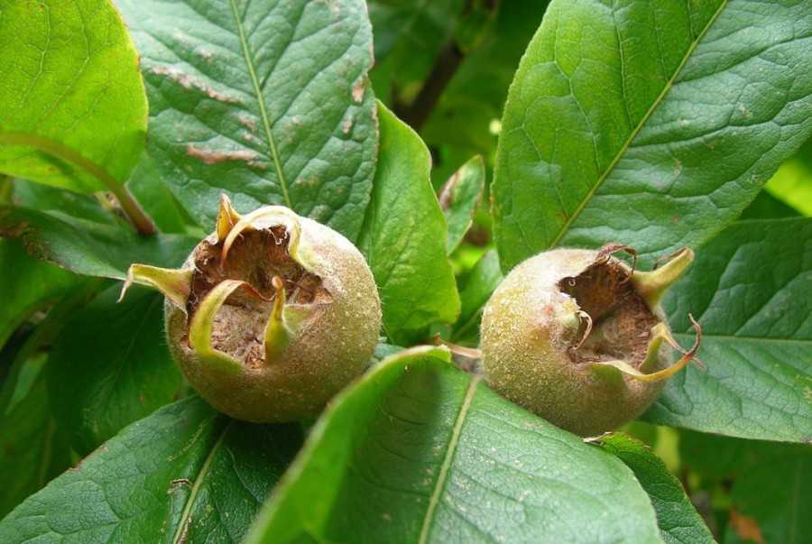 Примерно в конце сентября или начале октябре мушмула начинает покрываться красивыми цветами, а первые плоды образуются на ветках весной. Довольно мясистые, относительно крупного размера, плоды, которые собраны в кисти, отличаются различной формой – фрукт мушмула может быть как округлым и шарообразным, так и грушевидным. Зачастую диаметр этих плодов достигает 8 сантиметров, но в основном они едва ли превышают размеры сливы.