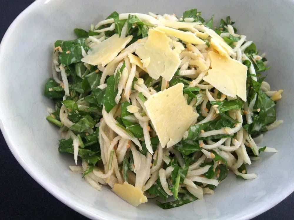 Дайкон — разновидность редьки, но вкус у этого корнеплода более мягкий. Салат, как правило, не готовят из дайконов-гигантов. У «переростков» мякоть постепенно утрачивает сочность, поэтому следует ориентироваться та твердые корнеплоды среднего размера.