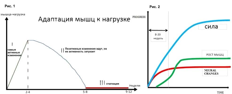 Первые 2-4 недели самые стрессовые для мышц, в них и происходит наиболее активное изменение оных, затем (с 5 по 8 неделю) идет фаза уменьшения отдачи от тренировки. В конечном итоге на 9-12 неделях (см. рис.), мышца перестает хорошо реагировать на программу тренировок и ей необходимо дать нагрузку отличную от обычной (происходит адаптация).