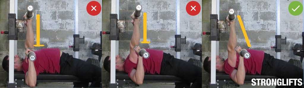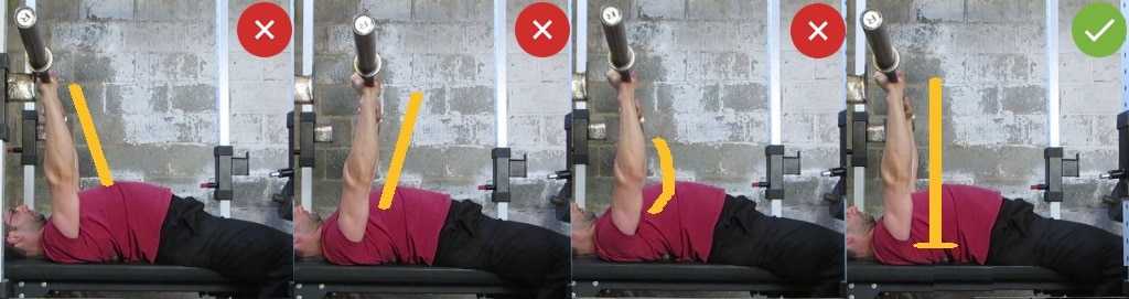В отличие от становой тяги или приседания, где штанга должна двигаться строго вертикально, в жиме лежа штанга двигается НЕ вертикально, а под углом к полу.