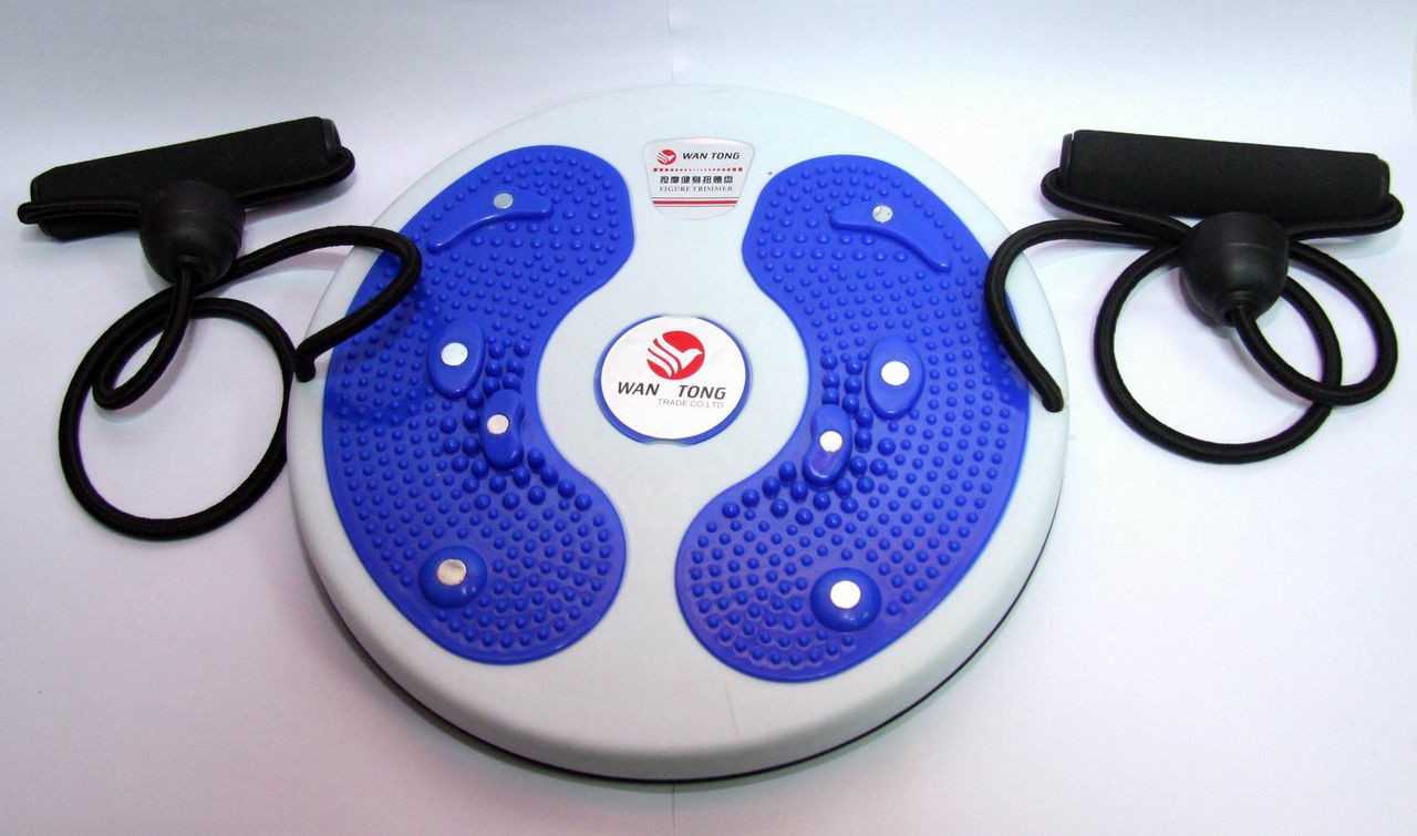 С конструктивной стороны дела диск здоровья представляет собой два металлических или пластиковых круга, с одинаковым диаметром – от 25 до 40 сантиметров, соединенных между собой шайбой. Между этими дисками расположены специальные дорожки со стальными подшипниками, благодаря которым конструкция может мягко вращаться. Более дорогостоящие модели дополнительно имеют на поверхности верхнего диска особые массажеры для стоп, воздействующие на биологически активные точки, расположенные на человеческих ногах. Часто круги для талии дополнительно оснащены эспандерами, с помощью которых можно эффективно прорабатывать мышцы рук и подтягивать грудь. Еще более дорогие аппараты оборудованы цифровым счетчиком, фиксирующим количество выполненных вращений и число затраченных во время тренировки калорий.