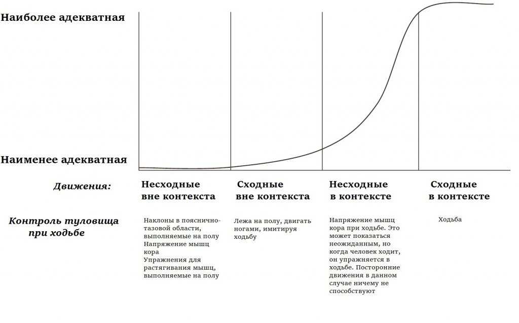 Тренировка стабильности кора нарушает три важных принципа. Первый из них — принцип специфичности. Условия тренировки имеют решающее значение, они должны быть адекватны поставленным задачам. Мы научаемся тому, чему учимся. Любимый пример д-ра Ледермана — пианист. Им нельзя стать, обучаясь игре на банджо или поднимая вес пальцами. Чтобы стать хорошим пианистом, нужно учиться играть на фортепиано.