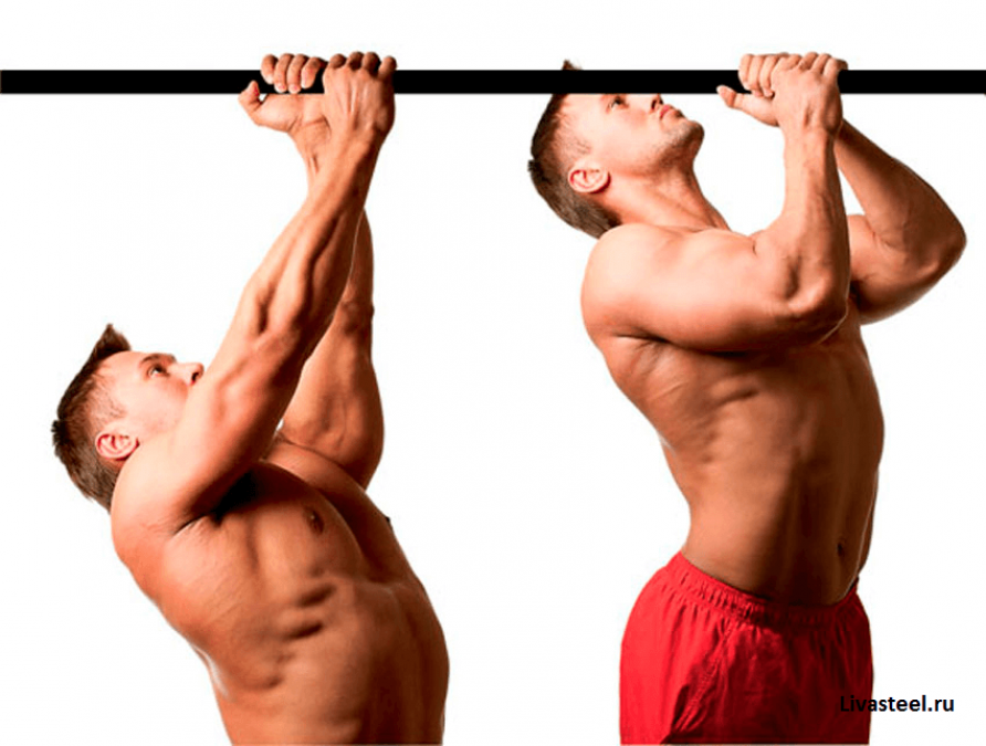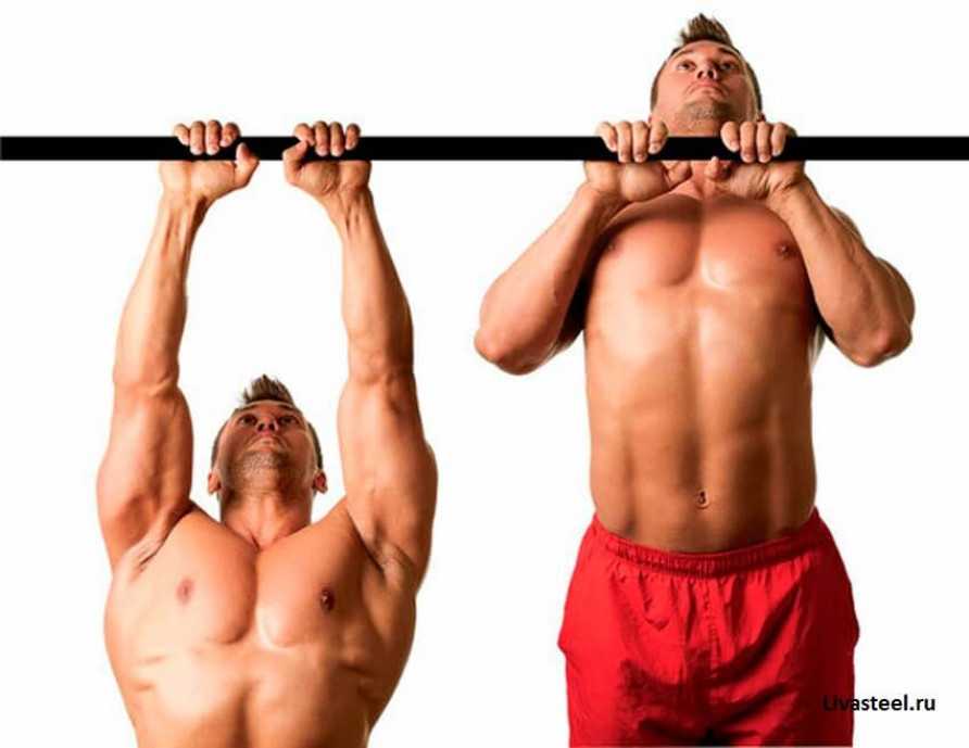 - Ширина хвата. Узкий хват, если руки спортсмена зафиксированы на перекладине уже плеч. Средний хват – руки расположены на ширине плеч или чуть шире. Широкий хват – расстояние между кистями рук значительно превышает ширину плеч.
