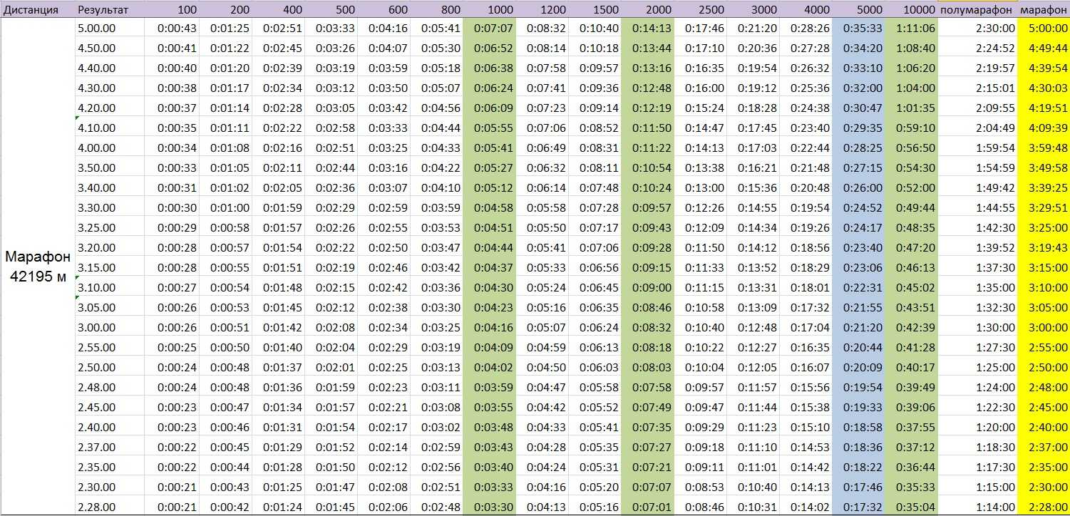 Таблица расчета темпа и скорости для разных дистанций, в том числе для полумарафона и марафона