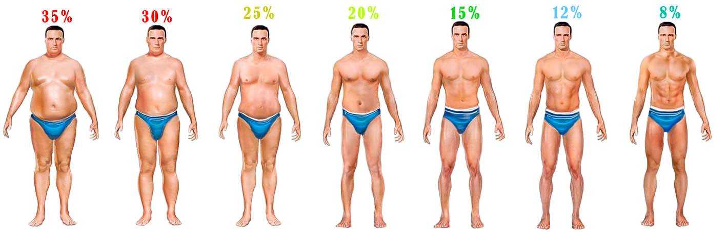 Процентное содержание жира у бодибилдеров во время их подготовки к соревнованиям может достигать всего лишь 3 – 4%. Такое содержание жира характеризуется повышенной васкулярностью, так, что вены видны буквально на каждой мышце тела. Даже на ягодицах можно увидеть небольшие промежутки между мышцами. Если таковые отсутствуют на ягодичных мышцах, значит содержание жира очень низкое. Нормальным количеством содержания жира у мужчин считается около 2%. Это необходимое количество для нормальной работы организма, так как жир защищает внутренние органы грудной части и брюшной полости.