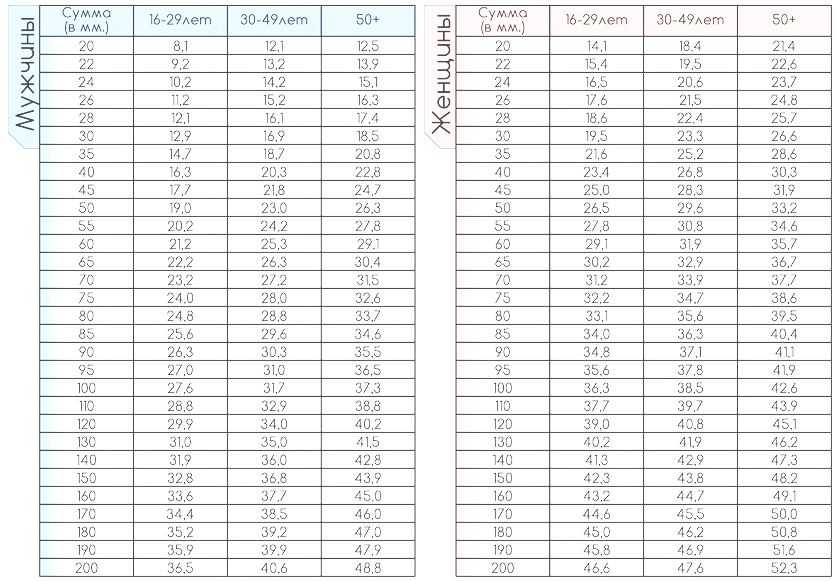 Складываем полученные цифры в мм и узнаём процент подкожного жира, пользуясь таблицей: