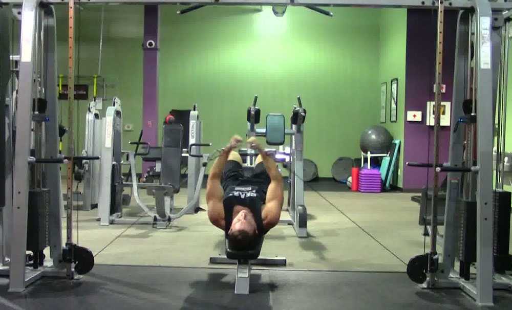 Назначение упражнения: формирование общей массы груди, проработка грудино-реберного и абдоминального отделов. Новичкам и девушкам рекомендуется жать с груди в тренажере Смита.
