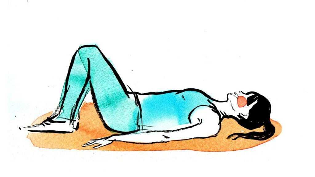 Чтобы разгрузить позвоночник, полезно начинать зарядку с упражнений, которые выполняются, лежа на полу (обязательно подложить под спину каремат). В самом начале занятий количество повторов каждого упражнения составляет 10 раз, со временем количество повторений можно увеличивать: