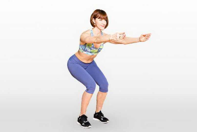 Ноги на ширине плеч. Приседать, не отрывая ноги от пола, вытягивая верхнюю часть корпуса вперед, а заднюю – назад. Посмотреть, как правильно выполнять это упражнение, можно на фото. После нескольких тренировок следует исполнять упражнение с гантелями в руках.
