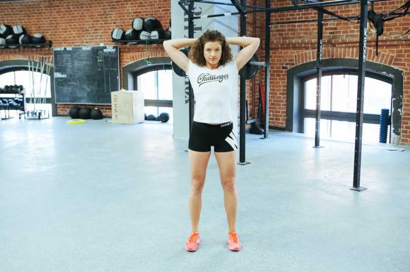 - Стойте прямо, ноги на ширине плеч. Поднимите руки и разведите в стороны.