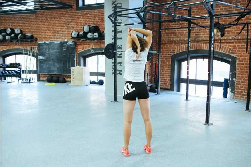 - Аккуратно заведите левый локоть за голову, придерживайте его правой рукой. Чтобы уменьшить напряжение мышц шеи, не наклоняйте голову вперёд. Мягко надавите правой ладонью на локоть, чтобы направить его как можно дальше от себя назад.