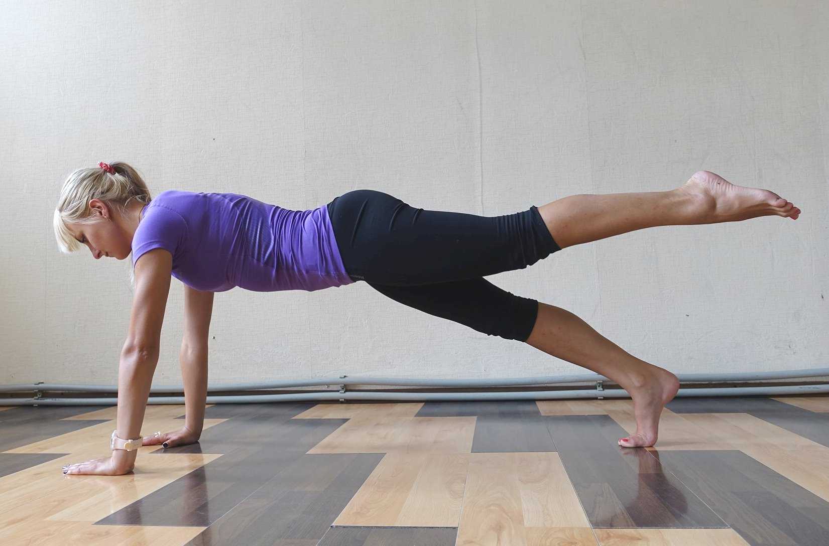 Начните в позиции полной планки, упираясь кистями в пол и держа бедра и мышцы живота напряженными. Поднимите одну ногу вверх, сжимая ягодицы. Держите ногу в воздухе несколько секунд, после чего перейдите к другой ноге и выполните то же самое