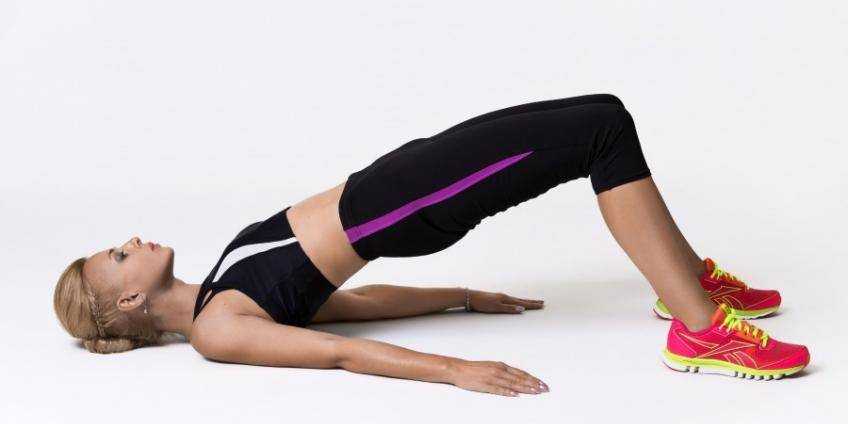 9) Упражнение «Подъем таза». Точка опоры идет на ладони, которые расположены за спиной. Ноги выпрямлены, вытянуты вперед и чуть разведены. Опора приходится на ладони и стопы. Максимально поднимайте таз, голова при этом откинута назад, мышцы шеи не напряжены. Сокращайте и расслабляйте мышцы влагалища, опускаясь на пол. Следует выполнить 8-12 подходов.