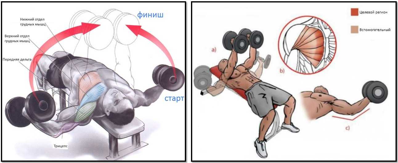 При выполнении упражнения, когда ноги находятся внизу, нагружается верхняя часть грудных мышц. Жим гантелей, когда голова находится ниже, чем ноги, прорабатывает нижнюю часть мышц груди. При использовании маленьких весов и большого количества повторений отлично убирает жир с груди.